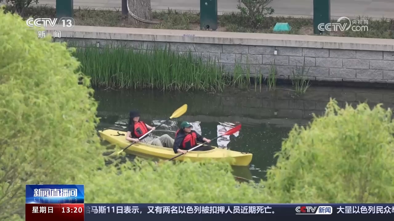 在北京朝陽區(qū)亮馬河畔水清岸綠,垂釣、散步、劃槳板的游人絡(luò)繹不絕,享受假日時(shí)光。
