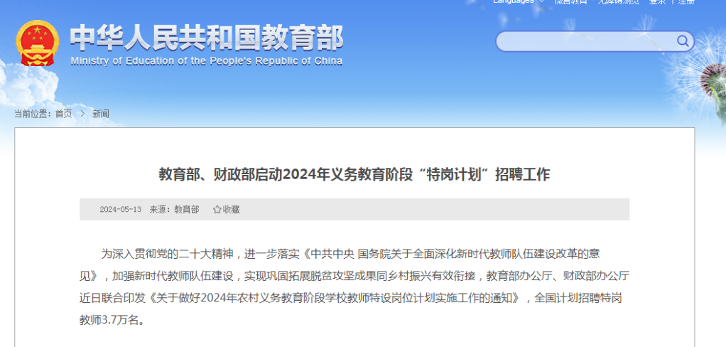 記者5月13日從教育部獲悉,教育部辦公廳、財政部辦公廳近日聯(lián)合印發(fā)通知,就做好2024年農(nóng)村義務(wù)教育階段學(xué)校教師特設(shè)崗位計劃實施工作進(jìn)行部署。根據(jù)通知,2024年全國計劃招聘“特崗計劃”教師37000名。
