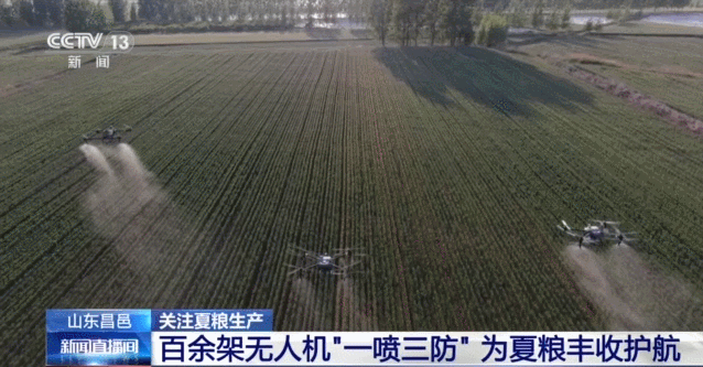 眼下正是小麥灌漿關(guān)鍵期,在山東省昌邑市柳疃鎮(zhèn)青阜農(nóng)業(yè)綜合體的一片高標準農(nóng)田里,幾架飛防無人機一字排開,白色水霧均勻噴灑在綠油油的麥田里。