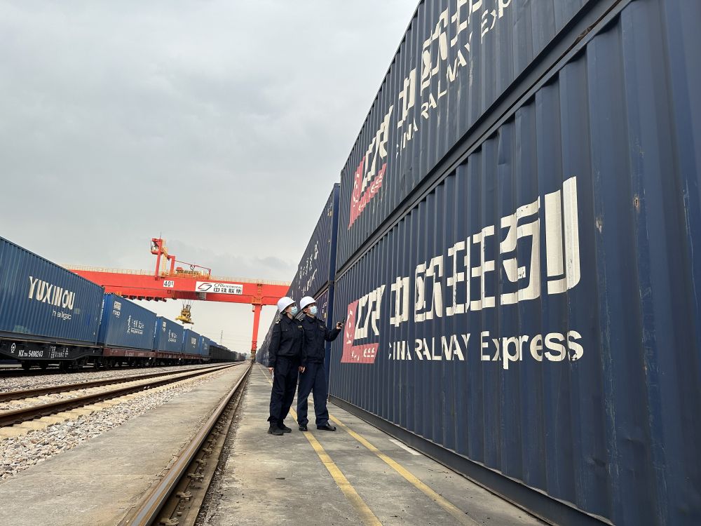 廣州海關(guān)所屬?gòu)V州車站海關(guān)關(guān)員對(duì)中歐班列出口貨物進(jìn)行監(jiān)管。(受訪者供圖)