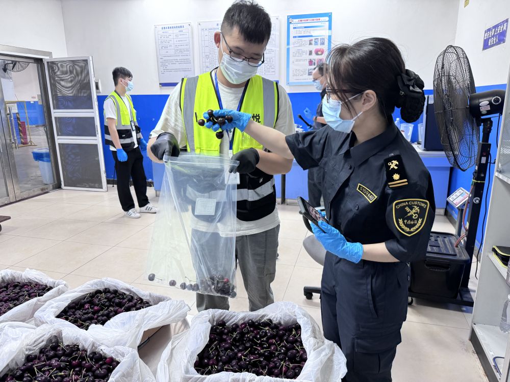 廣州白云機(jī)場(chǎng)海關(guān)關(guān)員對(duì)新產(chǎn)季進(jìn)口車?yán)遄舆M(jìn)行監(jiān)管。(受訪者供圖)