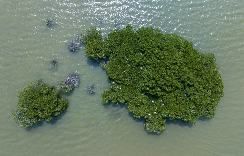 鷺鳥在廣東湛江金牛島的紅樹林上棲息(2024年5月17日攝,無人機(jī)照片)。廣東湛江紅樹林國家級(jí)自然保護(hù)區(qū),是中國面積最大、分布最集中的紅樹林自然保護(hù)區(qū),是世界濕地生態(tài)恢復(fù)的成功范例。