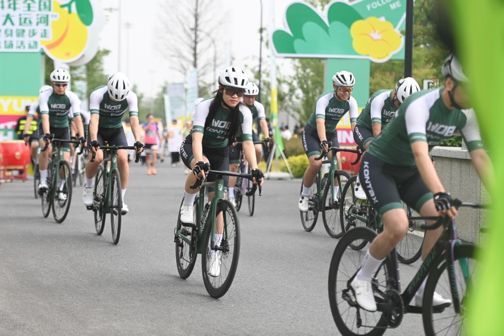 5月19日,2024年全國“行走大運河”全民健身健步走活動浙江站主會場活動舉行。圖為騎行愛好者從京杭大運河杭州臨平段塘棲運動活力園出發(fā)。新華社記者 黃宗治 攝