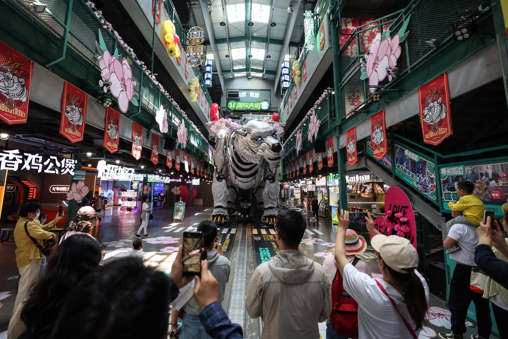 大連熊洞街,當(dāng)身高6米、重達(dá)25噸,灰色的仿生機(jī)械巨熊時而張口咆哮,時而緩緩前行,游客爆發(fā)出陣陣歡呼。大連冰山慧谷發(fā)展有限公司總經(jīng)理助理藍(lán)費(fèi)靜說:“這一街區(qū)由擁有近百年歷史的大連冰山集團(tuán)舊址改造而來,現(xiàn)已匯聚上百家游樂、電玩、研學(xué)商戶,老廠房煥發(fā)了新生機(jī)?!?/p>