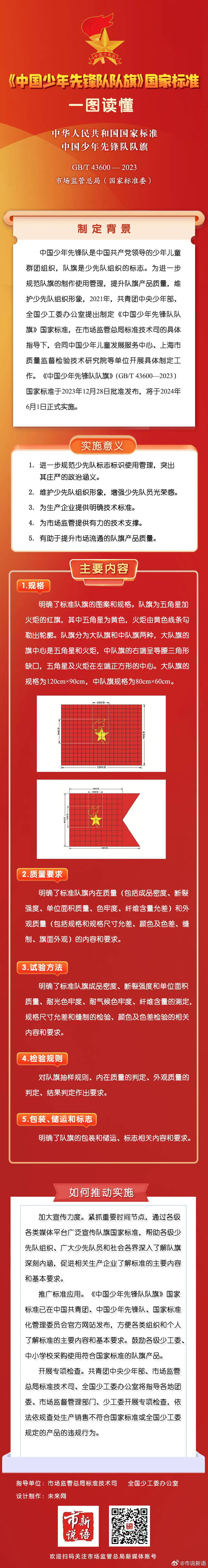 《中國少年先鋒隊(duì)隊(duì)旗》(GB/T 43600—2023)國家標(biāo)準(zhǔn)將于2024年6月1日正式實(shí)施。該標(biāo)準(zhǔn)由市場監(jiān)管總局(國家標(biāo)準(zhǔn)委)批準(zhǔn)發(fā)布,共青團(tuán)中央、全國少工委會同相關(guān)單位編制。