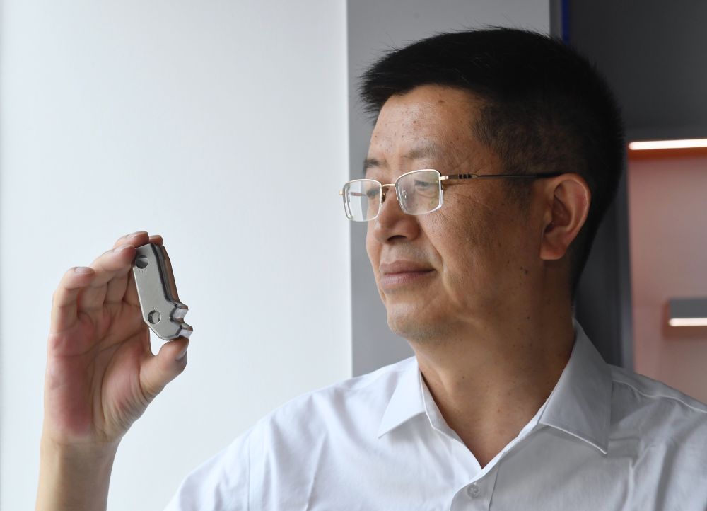 5月24日,在位于成都的中國核動(dòng)力研究設(shè)計(jì)院內(nèi),鐘元章在展示通過3D打印的堆內(nèi)構(gòu)件堆芯圍筒。鐘元章介紹,通過3D打印的方式來生產(chǎn)“華龍一號”的零部件,是目前的一個(gè)研究方向。