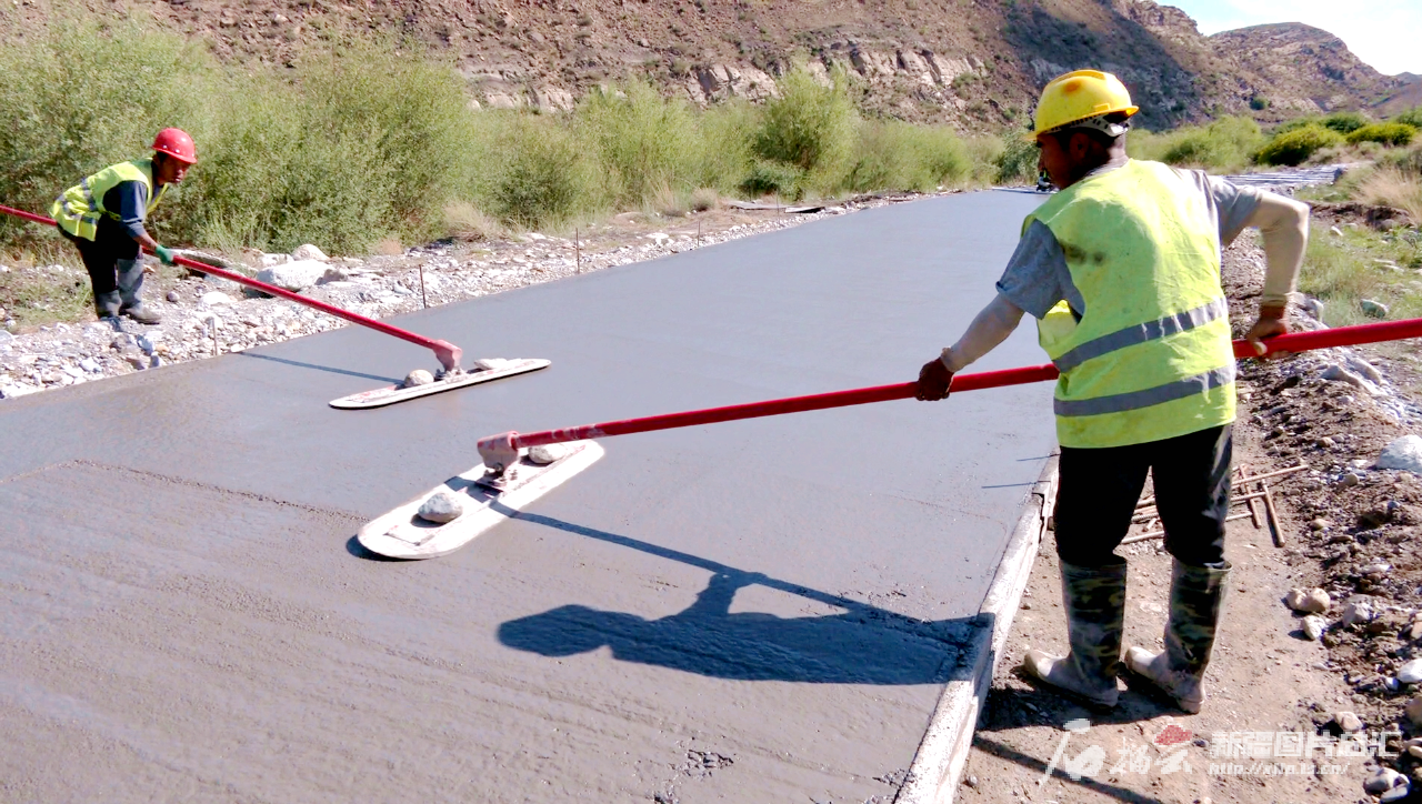 5月30日,拜城縣鐵熱克鎮(zhèn)農(nóng)村公路建設(shè)現(xiàn)場,工人們把混凝土澆筑在路基上,抹平、凝固后,一段路就形成了。