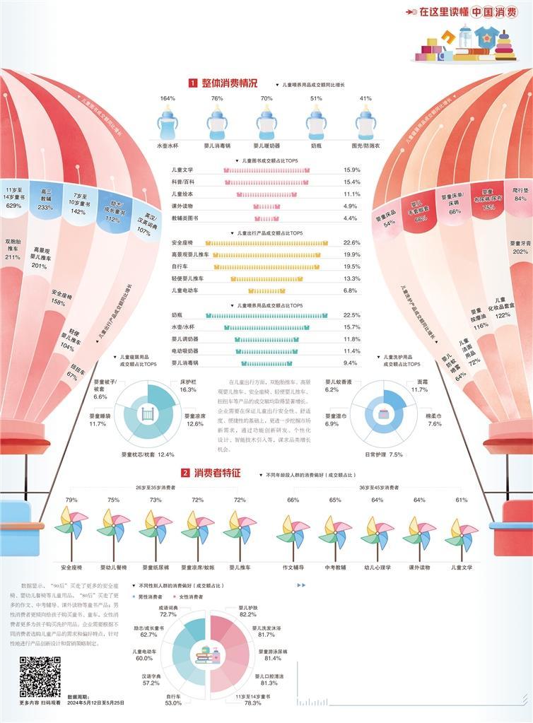 消費(fèi)者精致育兒需求不斷升級(jí),圍繞功能需求細(xì)分、場(chǎng)景消費(fèi)精細(xì)化等維度的兒童用品受到越來(lái)越多關(guān)注。在兒童喂養(yǎng)用品消費(fèi)中,水壺水杯、嬰兒消毒鍋、嬰兒暖奶器、奶瓶等成交額同比增長(zhǎng)超五成;在兒童洗護(hù)用品消費(fèi)中,嬰童牙膏、嬰童按摩油等產(chǎn)品成交額同比增長(zhǎng)超100%。