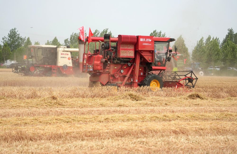 6月2日,在山東省臨沂市郯城縣廟山鎮(zhèn),參加小麥機收減損技能大比武的農(nóng)機手駕駛聯(lián)合收割機收獲小麥。 新華社記者 徐速繪 攝
