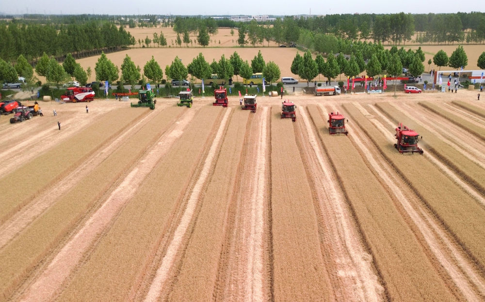 麥浪翻滾,沃野生金。麥田中,10臺收割機依次排開;一聲令下,農(nóng)機手駕駛收割機勻速前行,風中搖曳的麥穗被吸入“腹中”,田間只剩下短短的麥茬。