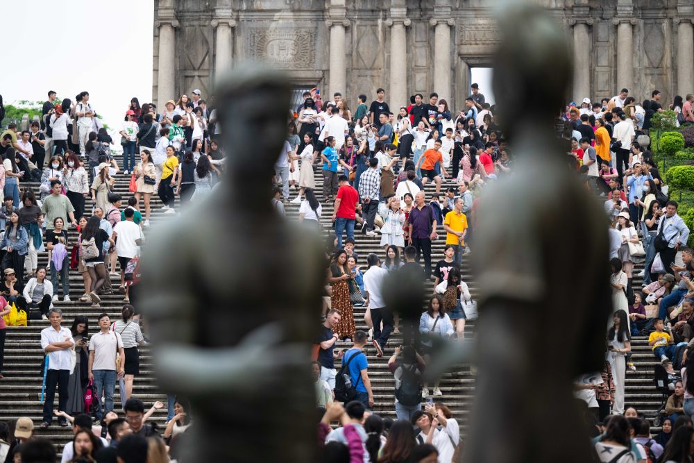 5月1日,游客在澳門大三巴牌坊前游覽。新華社記者 張金加 攝