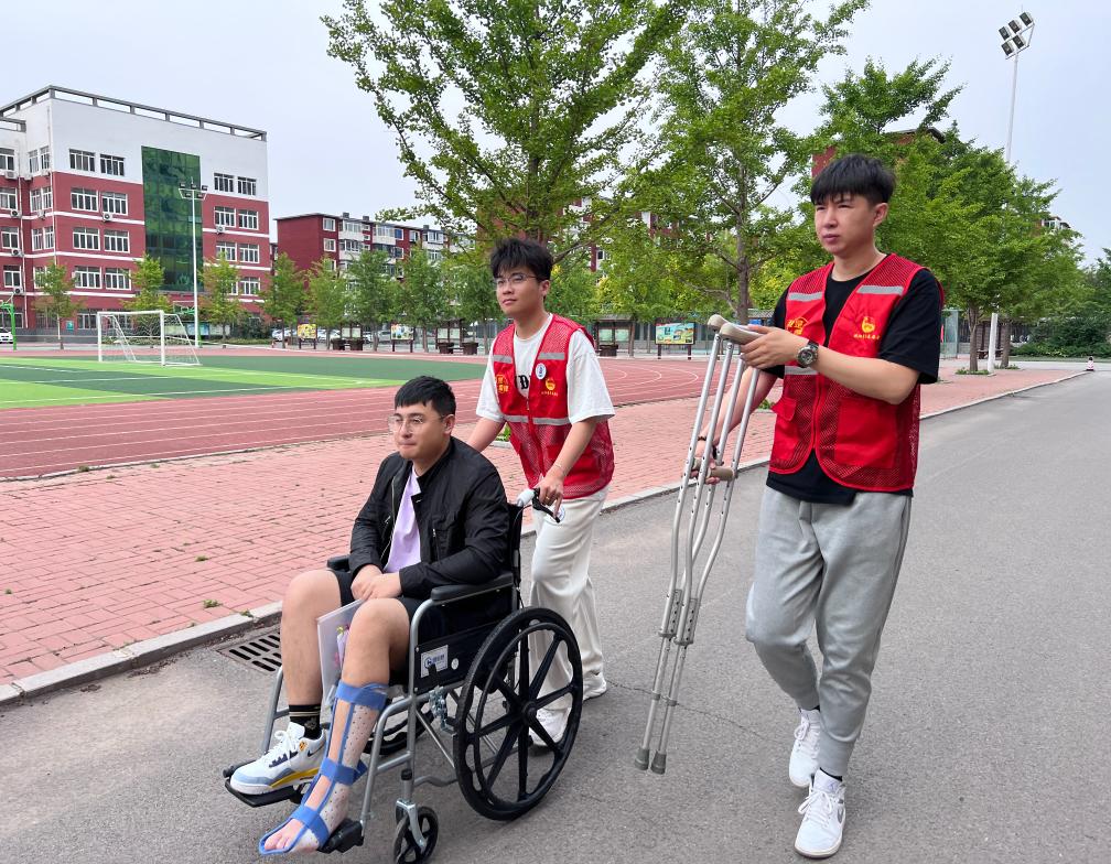 “我腳受傷了,行走不方便,你們能推我進(jìn)考場嗎?”“沒問題!我們會(huì)全程陪你進(jìn)出考場。”沈陽市第五十三中學(xué)考點(diǎn)門口,當(dāng)看到一位考生坐著輪椅行動(dòng)不便時(shí),志愿者們迅速承擔(dān)起了接送任務(wù)。