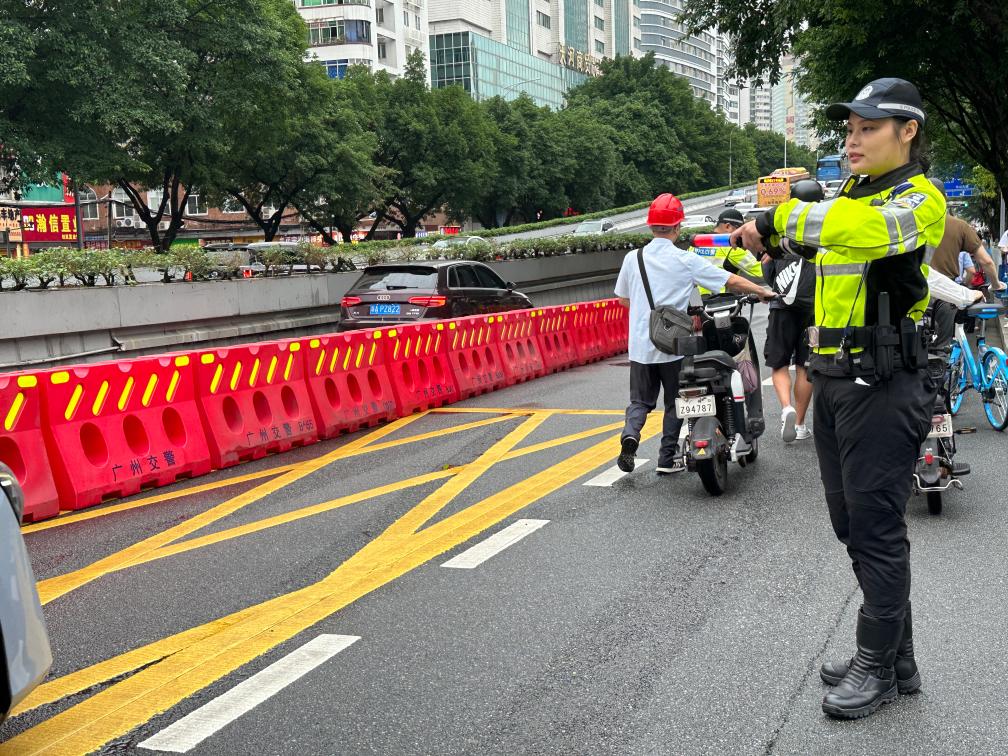 6月7日上午,交警在華南師范大學(xué)附屬中學(xué)考點(diǎn)外指揮交通。新華社記者楊淑馨 攝