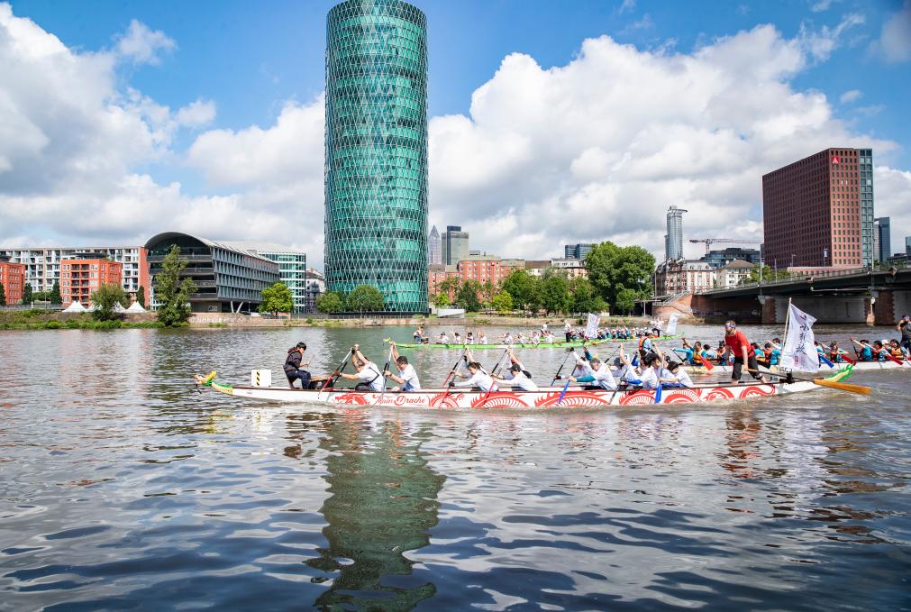 5月25日,在德國法蘭克福,龍舟隊伍在美因河上參加比賽。第一屆法蘭克福國際龍舟友誼賽暨2024年法蘭克福中國節(jié)開幕式當(dāng)日舉行,來自中國、德國、意大利等國的龍舟隊同臺競技,現(xiàn)場豐富多彩的中國文化展演活動吸引大批觀眾參與。新華社記者 張帆 攝