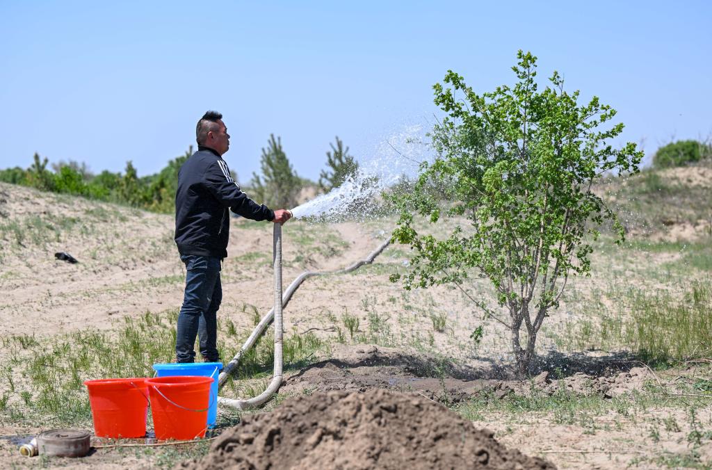 5月15日,在內(nèi)蒙古通遼市科左后旗甘旗卡鎮(zhèn)巴克要系統(tǒng)化治理項(xiàng)目區(qū),工作人員在給一棵楓樹澆水。新華社 連振 攝
