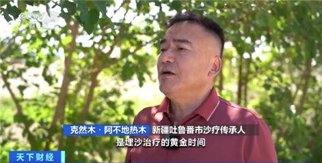 新疆吐魯番市沙療傳承人 克然木·阿不地?zé)崮荆?/strong>每年6月份至9月份是埋沙治療的黃金時(shí)間,去年我們共接待游客10萬(wàn)人次,今年有望進(jìn)一步突破。