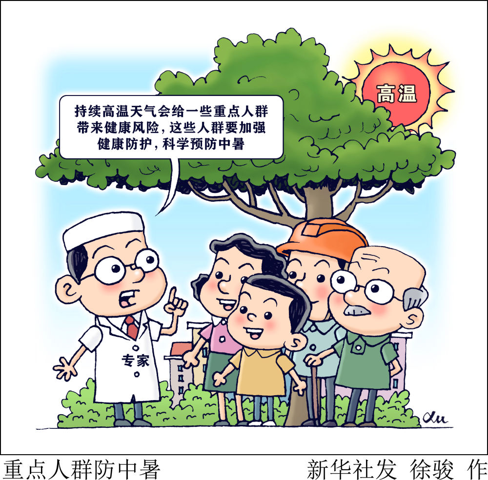國(guó)家疾控局此前發(fā)布的《高溫?zé)崂斯娊】捣雷o(hù)指南》明確,高溫?zé)崂私】捣雷o(hù)的重點(diǎn)人群包括:敏感人群,如兒童、孕婦、老年人等人群;慢性基礎(chǔ)性疾病患者,如循環(huán)系統(tǒng)疾病、呼吸系統(tǒng)疾病、精神與行為障礙、腎臟疾病及糖尿病等患者;戶外作業(yè)人員,如農(nóng)民、建筑工人、環(huán)衛(wèi)工人、快遞員等人員。