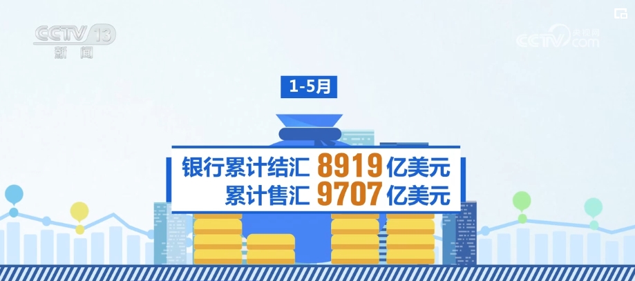 國家外匯管理局最新數(shù)據(jù)顯示,5月,銀行結匯1760億美元、售匯1919億美元;1—5月,銀行累計結匯8919億美元、累計售匯9707億美元。