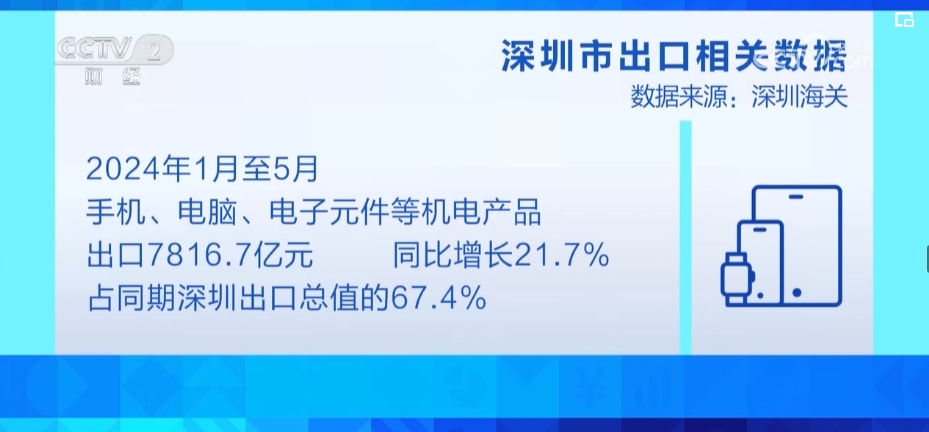 2024年前5個月,深圳市出口總額達1.16萬億元,同比增長37.2%。其中,手機、電腦、電子元件等機電產(chǎn)品出口7816.7億元,同比增長21.7%,占同期深圳出口總值的67.4%。