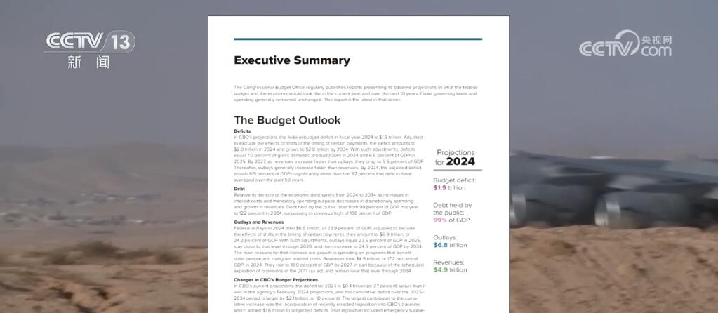 美國國會預(yù)算辦公室18日發(fā)布報告稱,在2024財年,聯(lián)邦政府預(yù)算赤字預(yù)計將達到1.9萬億美元。
