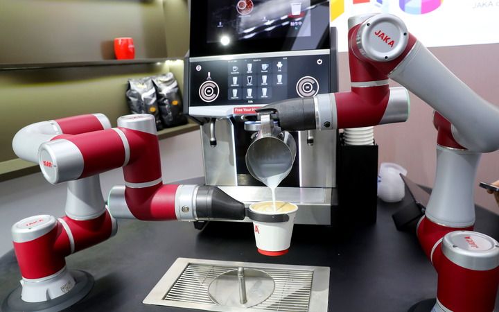 節(jié)卡機(jī)器人股份有限公司上海展廳內(nèi),機(jī)器人在表演調(diào)制咖啡(5月24日攝)。新華社記者 龔兵 攝
