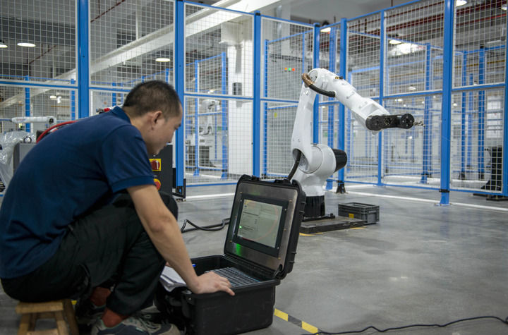 在廣東拓斯達(dá)科技股份有限公司,工作人員對一臺工業(yè)機(jī)器人進(jìn)行絕對定位精度的校準(zhǔn)(5月17日攝)。新華社記者 徐嘉懿 攝