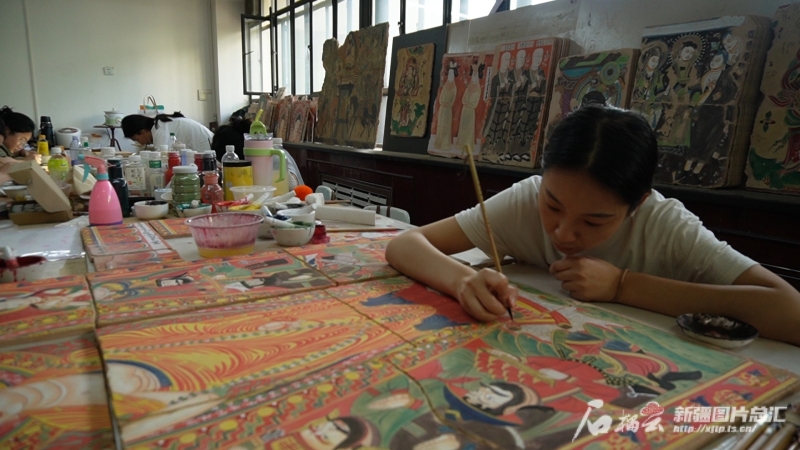烏魯木齊職業(yè)大學(xué)學(xué)生在制作龜茲壁畫復(fù)原作品。石榴云/新疆日報 記者宋海波攝