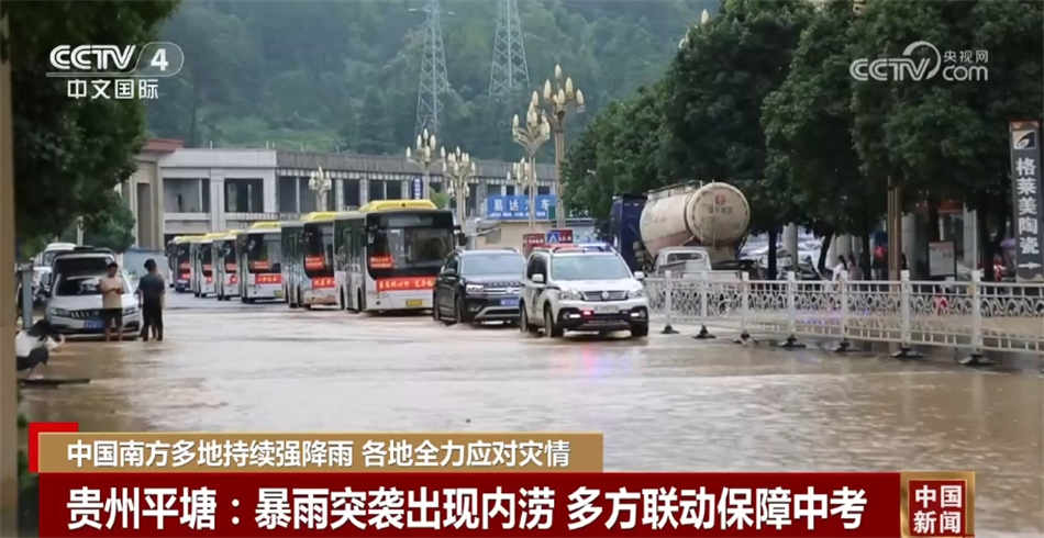 受強(qiáng)降雨的影響,23日,貴州平塘縣低洼路段出現(xiàn)內(nèi)澇。恰逢當(dāng)?shù)刂锌甲詈笠惶?,為保障學(xué)生順利參考,平塘縣第一時間啟動應(yīng)急預(yù)案,引導(dǎo)接送考生車輛安全行駛。