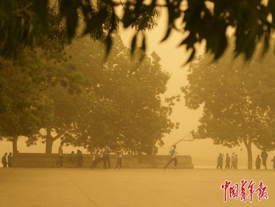 這時(shí)候,學(xué)生們?nèi)哉驹诓賵?chǎng)上說話,上課鈴響了,才慢慢踱回樓里。學(xué)校外面,路邊的人就坐在沙霧里吃燒烤,出租車大敞著窗戶載客,騎電動(dòng)車的人偶爾瞇起眼睛,沙子打得臉疼,也絕不戴口罩。之后,人們像掃雪一樣,耐心地掃去門口、窗臺(tái)上的沙土。