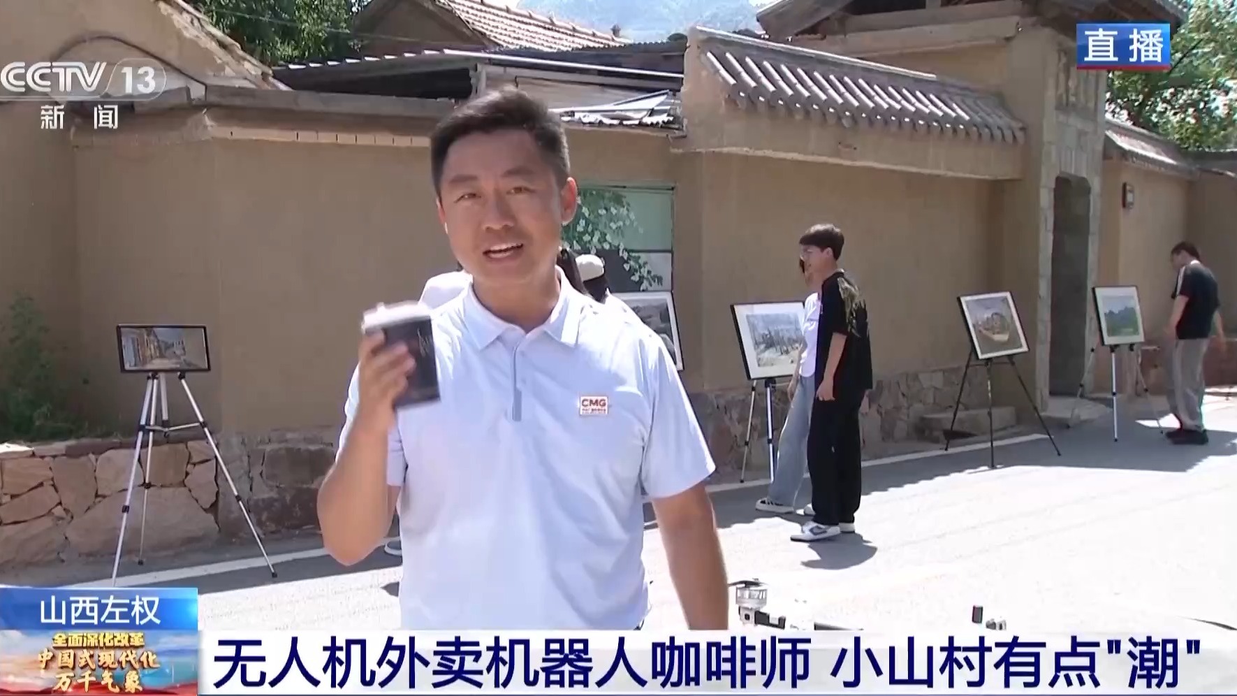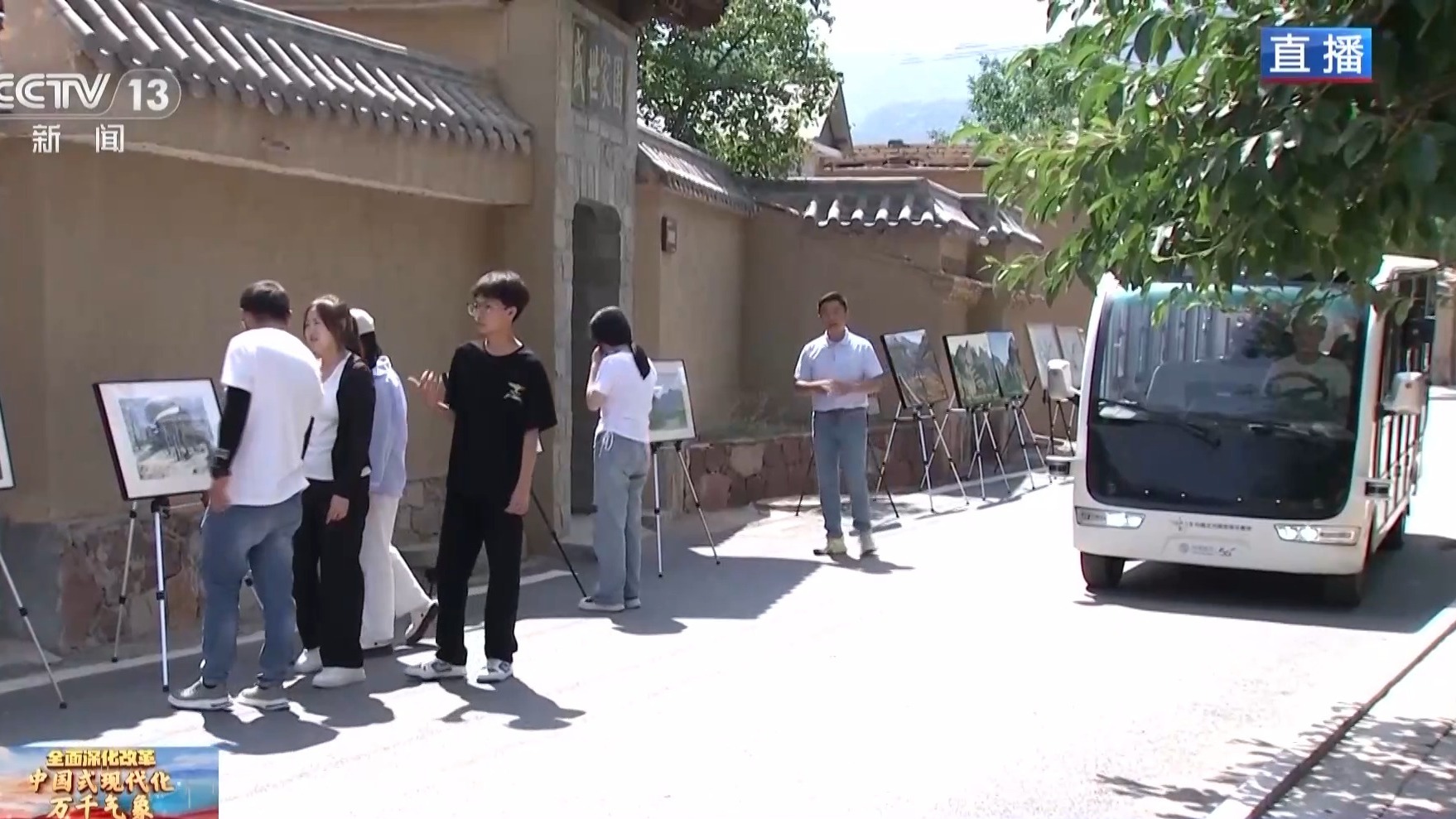 總臺記者 胡曉冬:走在村里,第一感受就是這個村子已經闖進藝術圈了。我相信大家已經注意到我身后的畫展,這些畫展時不時會出現(xiàn)在小山村的大街小巷中,讓藝術氣息充滿各個角落。
