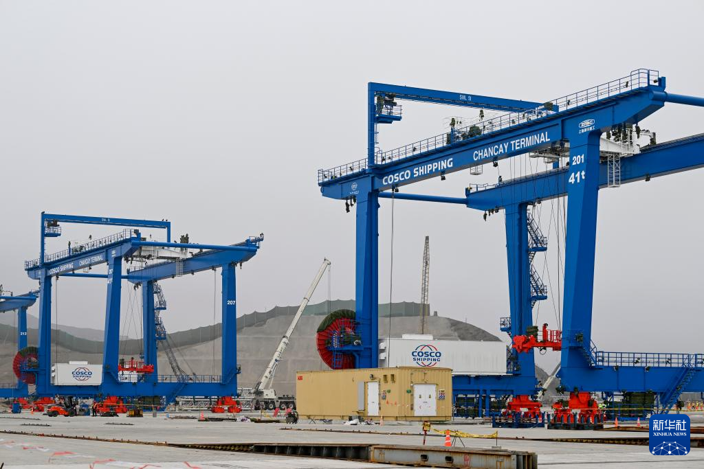 這是6月21日在秘魯錢凱港拍攝的印有“中遠(yuǎn)海運(yùn),錢凱碼頭”字樣的軌道吊。 新華社記者 李木子 攝