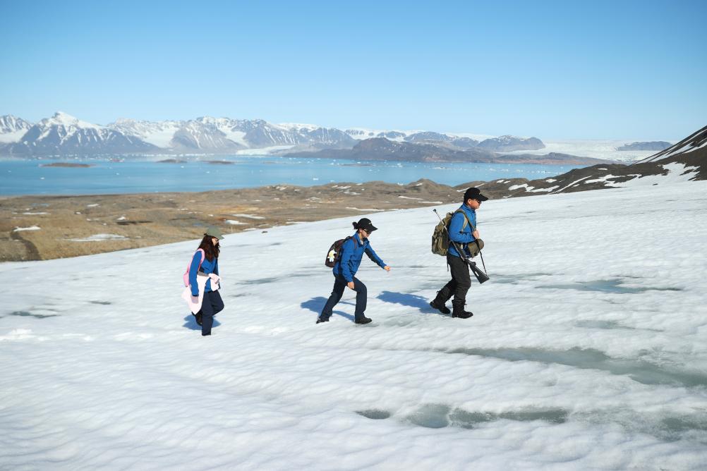 圖為2024年6月22日,在挪威新奧勒松,科考隊(duì)員胡正毅(右)、趙紅穎(中)、武小涵外出進(jìn)行采樣工作。(新華社記者趙丁喆攝)