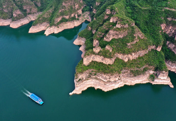 這是在河南省濟(jì)源市拍攝的黃河三峽景色(2024年5月28日攝,無人機(jī)照片)。新華社記者 李安 攝