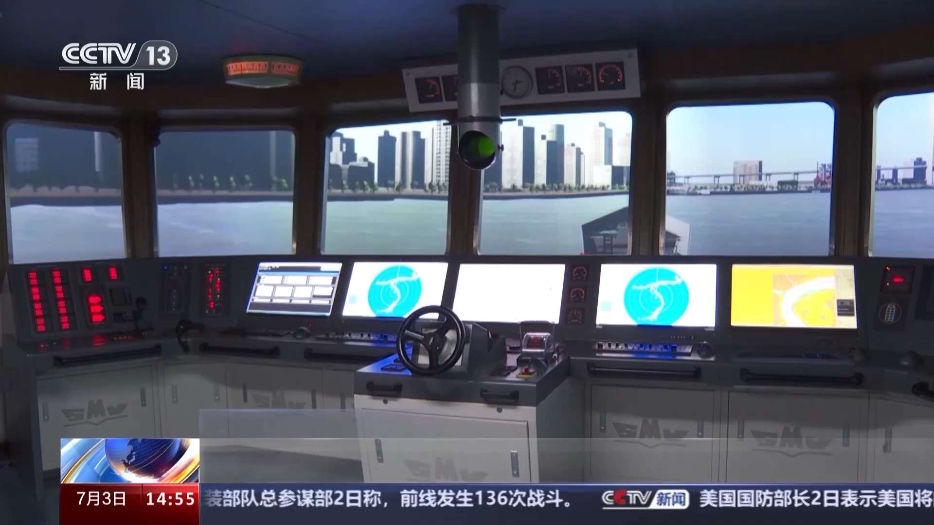 舵輪右手邊的手柄,用來控制主機轉(zhuǎn)速。操縱臺的左右兩邊,為雷達監(jiān)測顯示屏幕,代替人眼感知環(huán)境,在霧天航行、夜間航行時給駕駛員提供便利。它以大型集裝箱船駕駛室為原型,盡可能還原現(xiàn)代化船舶駕駛工作的真實場景。