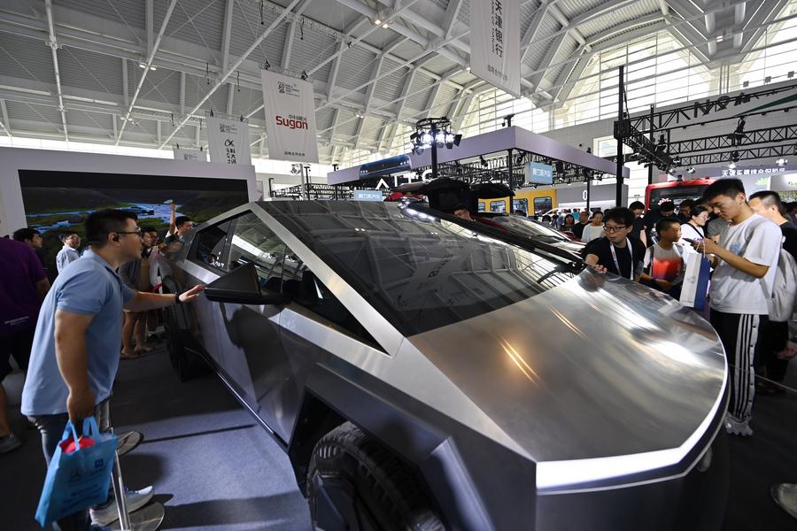 在天津舉行的2024世界智能產(chǎn)業(yè)博覽會上,觀眾在特斯拉展臺參觀(6月22日攝)。新華社記者 李然 攝