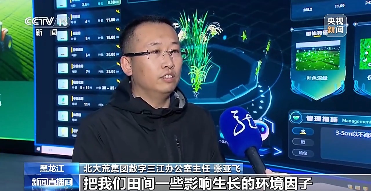北大荒集團數(shù)字三江辦公室主任 張亞飛:通過無人機群把我們田間的一些影響生長的環(huán)境因子采集回來,然后輸入到我們的大模型之內(nèi),采取的手段是空、天、地、人機一體化的感知手段,形成當時、當季需要進行的農(nóng)事活動的決策指令,通過這個數(shù)字生產(chǎn)模型來指導我們的種植戶更加科學地進行種植,提高水稻單產(chǎn)。