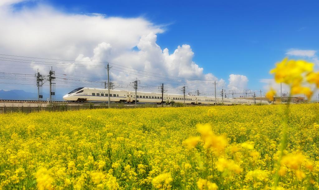 白色動(dòng)車在門(mén)源的草原上疾馳,遠(yuǎn)處的油菜花田里滿是泛黃的花苞。