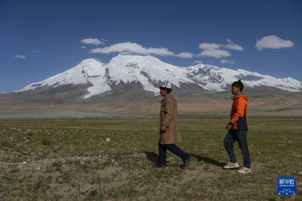 7月6日,塔西巴伊(右)和父親加尼拜克路過慕士塔格峰腳下的牧場(chǎng)。新華社記者 胡虎虎 攝
