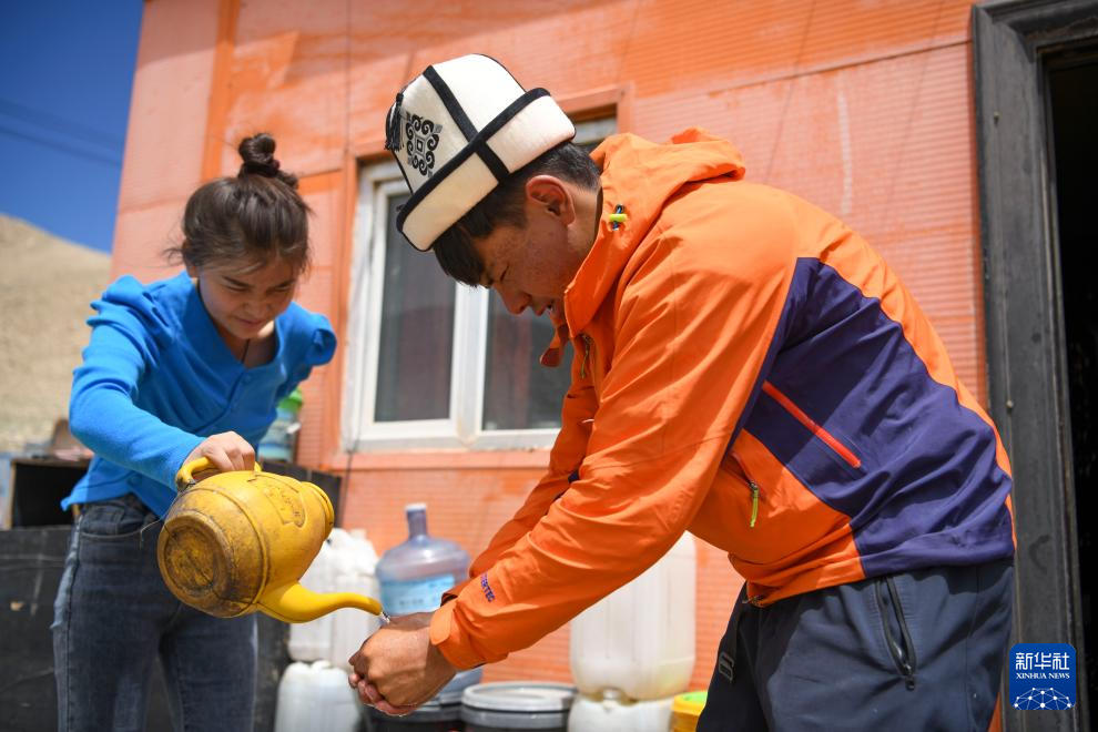 7月5日,塔西巴伊下山后回到家,妹妹為其倒水洗手。新華社記者 胡虎虎 攝