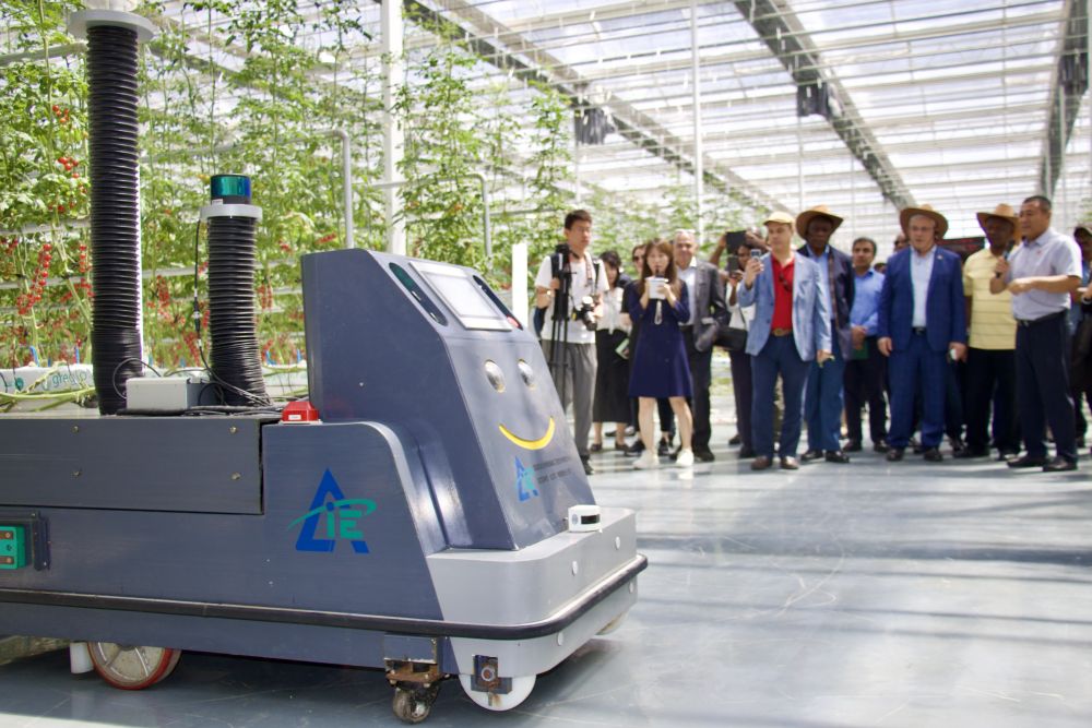 鄂爾多斯市達(dá)拉特旗德農(nóng)現(xiàn)代高效設(shè)施農(nóng)業(yè)產(chǎn)業(yè)園13000平米的大棚內(nèi),全自動(dòng)機(jī)器人在無土栽培的西紅柿藤蔓間往來穿梭,高效完成巡檢、采摘、施肥等各項(xiàng)工作。使節(jié)們邊看邊贊嘆不已。