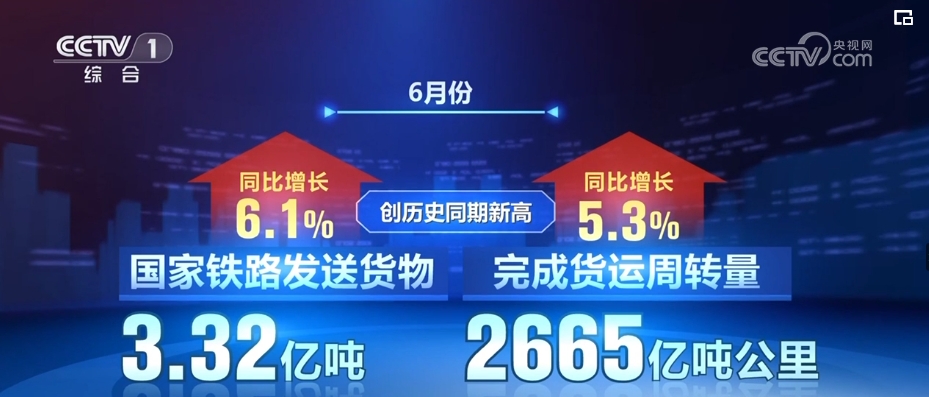 記者7月14日從國(guó)鐵集團(tuán)獲悉,6月份,國(guó)家鐵路發(fā)送貨物3.32億噸,完成貨運(yùn)周轉(zhuǎn)量2665億噸公里,同比分別增長(zhǎng)6.1%、5.3%,創(chuàng)歷史同期新高。