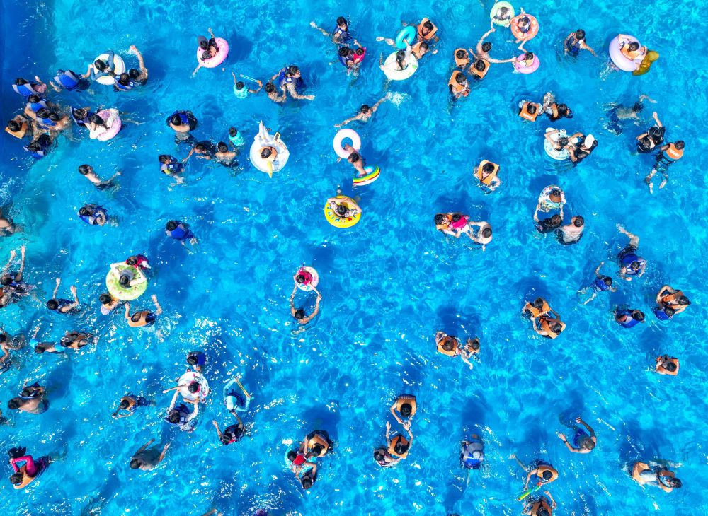 7月14日,人們?cè)谥貞c市酉陽土家族苗族自治縣一水上樂園游玩戲水(無人機(jī)照片)。新華社發(fā)(邱洪斌攝)
