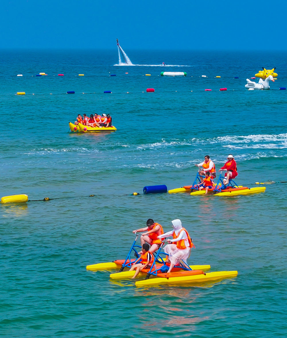 7月13日,游客在山東省榮成市那香海海水浴場體驗(yàn)水上娛樂項(xiàng)目(無人機(jī)照片)。新華社發(fā)(李信君攝)