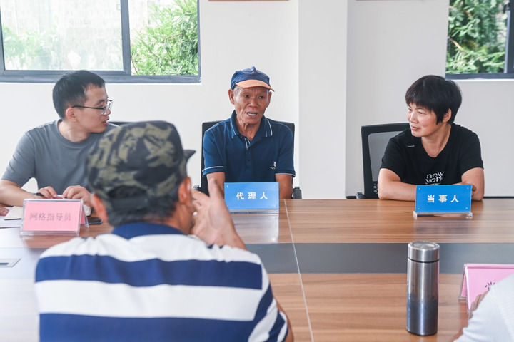 2023年7月26日,在浙江省諸暨市東白湖鎮(zhèn)婁東村新時代文明實踐站的文明共富會客廳內(nèi),網(wǎng)格長召集村里矛盾雙方當(dāng)事人以及黨員代表、鄉(xiāng)賢代表、人大代表等成員進行宅基地指標糾紛的現(xiàn)場調(diào)解。新華社記者 徐昱 攝