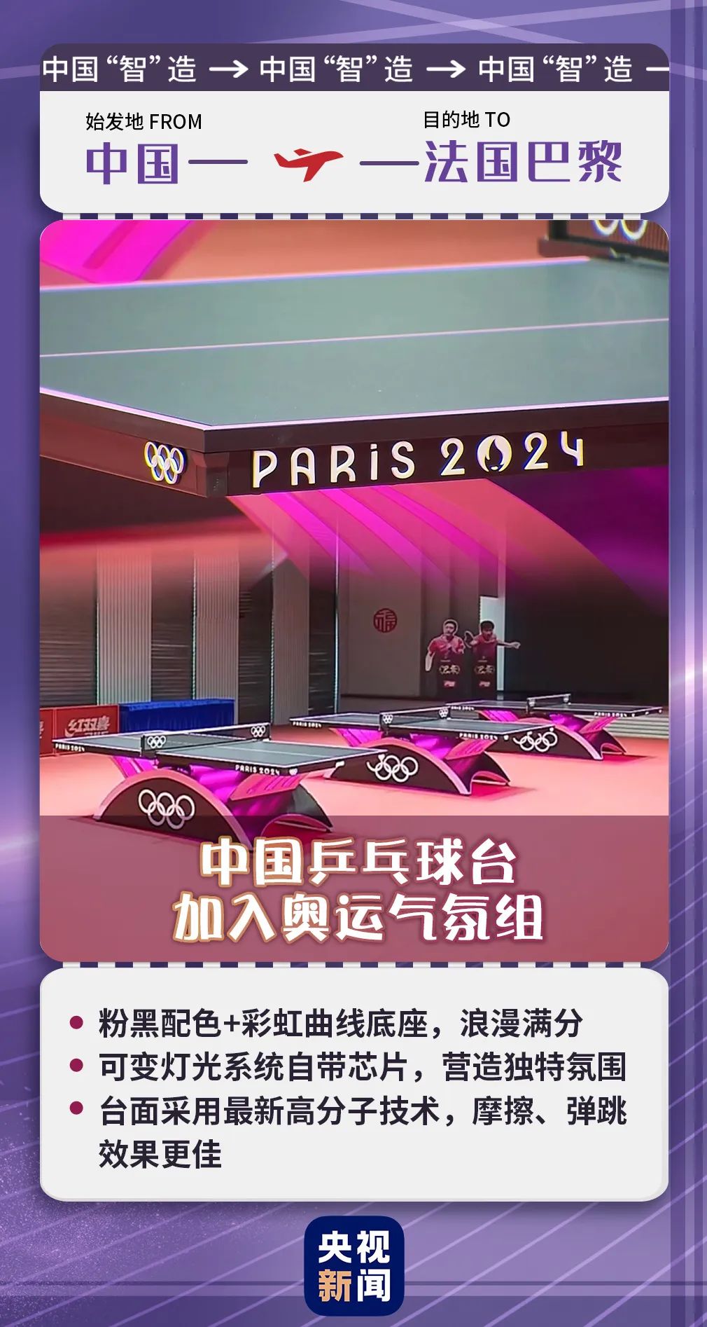 這次巴黎奧運(yùn)會(huì)的乒乓球球桌是由中國(guó)“智”造的,是粉、黑色,搭配彩色的曲線底座,期待這樣浪漫的氛圍加上浪漫的巴黎,會(huì)有怎么樣的碰撞!