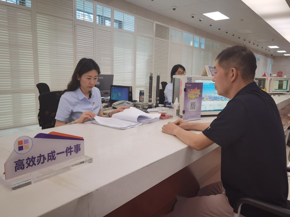 7月17日,在天津?yàn)I海新區(qū)政務(wù)服務(wù)中心“高效辦成一件事”專區(qū),企業(yè)負(fù)責(zé)人正在提交申請材料。新華社記者楊文 攝
