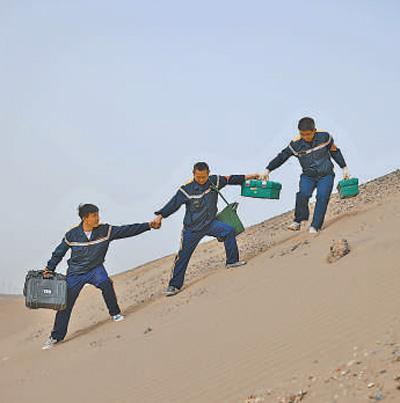 班組成員在翻越沙丘。 2014年,烏魯木齊西車輛段哈密動(dòng)態(tài)檢測(cè)車間哈羅班組正式成立,負(fù)責(zé)維護(hù)哈羅鐵路沿線設(shè)備。10年來(lái),哈羅班組堅(jiān)守在環(huán)境惡劣、條件艱苦的羅布泊,克服重重困難,做好鐵路巡檢和故障維修,保障鉀肥運(yùn)輸。 羅布泊,位于新疆東南部塔克拉瑪干沙漠邊緣,天上無(wú)飛鳥,地上不長(zhǎng)草,只有漫無(wú)邊際的沙漠、戈壁、鹽堿灘。 這里一年中有200多天風(fēng)沙肆虐,夏季氣溫超過50攝氏度,冬季氣溫低至零下30攝氏度。這里是中國(guó)鐵路烏魯木齊局集團(tuán)有限公司烏魯木齊西車輛段哈密動(dòng)態(tài)檢測(cè)車間哈羅班組工作的地方。 是什么讓他們選擇到羅布泊工作?又是什么工作值得他們?cè)谶@里堅(jiān)守10年? “鐵路修到哪兒,人員就要配到哪兒” 嗚—— “火車進(jìn)站了,快!” 哈羅班組工長(zhǎng)臺(tái)欣龍和伙伴們沖向站臺(tái),幾個(gè)人一下子堵在了車門前。 “老吳,這回有啥?” “今兒有羊肉、雞蛋,還有一袋子番茄?!?/p> “嘿嘿嘿?!?/p> 車門旁,幾個(gè)大小伙兒咧著嘴憨笑。 臺(tái)欣龍工作的地方,叫羅中站,是哈羅鐵路的最后一站,地處羅布泊中心。這里雖通了電、通了水,但米、面、糧、油、飲用水等生活物資全靠火車從400公里外的哈密市送來(lái)。 “大小伙兒們,自己搬水。”列車長(zhǎng)老吳一聲令下,臺(tái)欣龍和伙伴們麻利地爬上車,一人扛下一桶15升的礦泉水。 “這兒的水堿性大,一燒開,全是白粒粒,沒法喝?!迸_(tái)欣龍說,這15升礦泉水得撐一周。 在羅中站,差不多每隔5天會(huì)有通勤列車抵達(dá),送來(lái)各類物資。 列車停留5小時(shí),隨即返程。羅中站經(jīng)歷短暫的熱鬧后,再次回歸平靜。 除了人少、地荒、物資緊,寂寞、單調(diào)或許是在羅中站工作、生活面臨的最大困難。 這里沒有商店、沒有飯館、沒有影院。白天,手機(jī)還能有網(wǎng)絡(luò)信號(hào),晚上則幾乎沒有信號(hào)。乒乓球、象棋以及少量書籍,為臺(tái)欣龍和伙伴們提供了少有的娛樂方式。 2014年,中國(guó)鐵路烏魯木齊局集團(tuán)有限公司烏魯木齊西車輛段哈密動(dòng)態(tài)檢測(cè)車間哈羅班組正式成立,負(fù)責(zé)維護(hù)哈羅鐵路沿線設(shè)備。當(dāng)年,剛畢業(yè)的臺(tái)欣龍來(lái)到了這里。 當(dāng)時(shí)也沒想太多,覺得在哪里都是干活,就接受了單位安排。“鐵路修到哪兒,人員就要配到哪兒,這活總得有人干?!迸_(tái)欣龍說。 如今,哈羅班組共有7人,大伙兒隔10天輪一次班。班組里年齡最大的丁鵬今年51歲了,最小的永志帥和杜權(quán)也已31歲。 “假如某個(gè)檢測(cè)站發(fā)出故障警報(bào),無(wú)論什么天氣,都必須立即響應(yīng)” 凌晨3時(shí)20分,顛簸了近5個(gè)小時(shí),臺(tái)欣龍和兩名隊(duì)員到達(dá)了黑龍峰動(dòng)態(tài)設(shè)備檢測(cè)站。這里,距離羅中站230公里。 夜間出行,沒有道路、沒有路燈、沒有導(dǎo)航,臺(tái)欣龍駕駛著皮卡車朝著鐵路延伸的方向在茫茫戈壁灘里蹚出路。這一路大坑套小坑,人的腦袋時(shí)不時(shí)頂?shù)杰図敚驳蒙邸?/p> 下了車,風(fēng)裹著沙子打在臉上、頭燈上,幾乎掩蓋了說話聲。時(shí)間長(zhǎng)了,臺(tái)欣龍和隊(duì)友們便形成了默契,只需一個(gè)手勢(shì),便知道對(duì)方的意思。 4時(shí)10分,臺(tái)欣龍和隊(duì)友開始作業(yè)。 打開紅外線軸溫探測(cè)設(shè)備(THDS)的機(jī)蓋,映入眼簾的是一層厚厚的沙塵。臺(tái)欣龍熟練地拿出吹風(fēng)機(jī)、毛刷,仔細(xì)清理室外探頭箱里的沙塵,再把黑體(一種檢測(cè)設(shè)備)放置在探頭箱上,進(jìn)行溫度檢測(cè)校準(zhǔn)。 “我們這里夏季溫度高,若列車輪對(duì)軸溫超標(biāo),就有斷軸風(fēng)險(xiǎn),引發(fā)安全事故。檢測(cè)儀器必須保證準(zhǔn)確性?!迸_(tái)欣龍解釋,根據(jù)標(biāo)準(zhǔn),THDS低溫檢測(cè)誤差正負(fù)不得超過2攝氏度,高溫時(shí)段不得超過3攝氏度?!暗覀冏约旱囊笫菍⒄`差控制在1攝氏度。” 早晨7時(shí),臺(tái)欣龍一行結(jié)束檢測(cè)任務(wù),踏上了回程路,直到中午12時(shí)才趕回駐地。 “今天這一路,算順利的?!迸_(tái)欣龍說,“假如某個(gè)檢測(cè)站發(fā)出故障警報(bào),無(wú)論什么天氣,都必須立即響應(yīng)?!痹诹_布泊,沙塵暴說來(lái)就來(lái),一刮就是三四個(gè)小時(shí)。有一回,他們遇上特大沙塵暴,風(fēng)暴像堵墻一樣迎面撲來(lái)。越野車迎風(fēng)的一側(cè),車漆幾乎全被風(fēng)沙打掉。“幸虧附近有座橋涵,大伙兒在里頭躲了3個(gè)多小時(shí)?!憋L(fēng)暴過后,衣服上、頭發(fā)上、耳朵里、鼻孔里全都是沙子。一抬腳,鐵道路基上的風(fēng)沙已沒過膝蓋。 還有一次,冬季雪夜,臺(tái)欣龍和隊(duì)友們?nèi)ヌ幚砭o急故障。大雪的掩蓋,讓茫茫戈壁更難辨認(rèn)方向?!拔覀円徊恍⌒淖咤e(cuò)了方向,跑了很多冤枉路,最終汽車油料不足,只能請(qǐng)求救援,天亮了才出來(lái)?!迸_(tái)欣龍說。 “檢修得跟上,為鉀肥運(yùn)輸做好保障” 無(wú)水、無(wú)人、無(wú)城,哈羅鐵路為何要修往羅布泊? 原來(lái),羅布泊寸草不生的地表之下,藏著世界上最大的硫酸鹽型含鉀鹵水礦床,占全國(guó)鉀資源量的三成。 長(zhǎng)期以來(lái),我國(guó)耕地面積中一半以上缺鉀,偏偏鉀鹽
