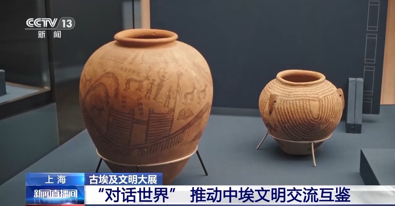 在“法老的國(guó)度”展廳里,與五百多件埃及文物同時(shí)展出的,還有上海博物館館藏的19件中國(guó)文物,與古埃及文物形成對(duì)照。古埃及陶罐展柜里,并列擺放著馬家窯文化時(shí)期的彩陶。