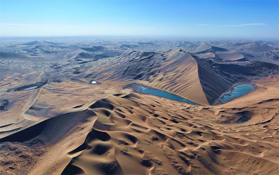 巴丹吉林沙漠地處阿拉善高原,屬中國西北極干旱的溫帶荒漠地區(qū),是中國第三大沙漠和第二大流動沙漠。該地區(qū)以連綿起伏的高大沙山和丘間眾多湖泊而聞名,展示了沙漠景觀不斷變換的地質(zhì)和地貌特征,令人嘆為觀止,全球少有沙漠可以比肩。巴丹吉林沙漠的重要標(biāo)志包括世界最高的固定沙山(相對高度達(dá) 460 米)、最密集的沙漠湖泊、最廣闊的鳴沙區(qū)域,以及多樣的風(fēng)蝕地貌。如此獨特的景觀展現(xiàn)了巴丹吉林沙漠非凡的自然美學(xué)價值,展示著地球上重要、典型且持續(xù)的風(fēng)沙地貌發(fā)展過程,同時也是豐富多彩的生物棲息地。