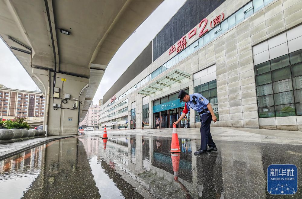 7月28日,在沈陽北站,沈陽鐵路公安處民警在出站口附近的積水處設(shè)立警示標(biāo)志?! ⌒氯A社發(fā)